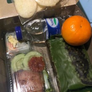 Nasi Bakar isi Ayam Pedas/Tuna Pedas, Lalap, Tahu Tempegoreng,Krupuk,Buah